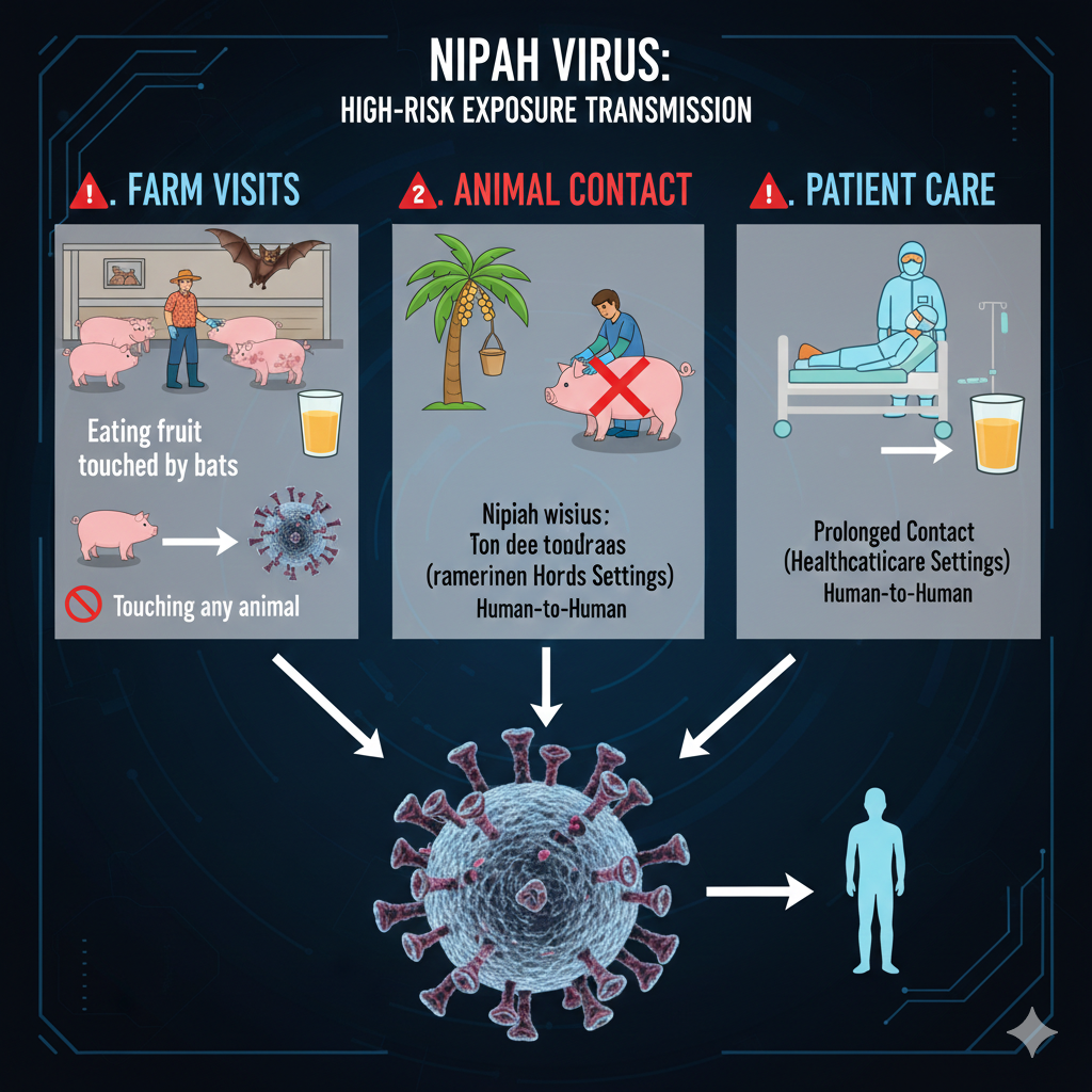 니파 바이러스는 동물에서 사람으로, 사람에서 사람으로 전파될 수 있는 고위험 바이러스입니다. 주로 박쥐가 자연 숙주이며, 감염된 돼지 또는 사람과의 접촉으로 전파됩니다.